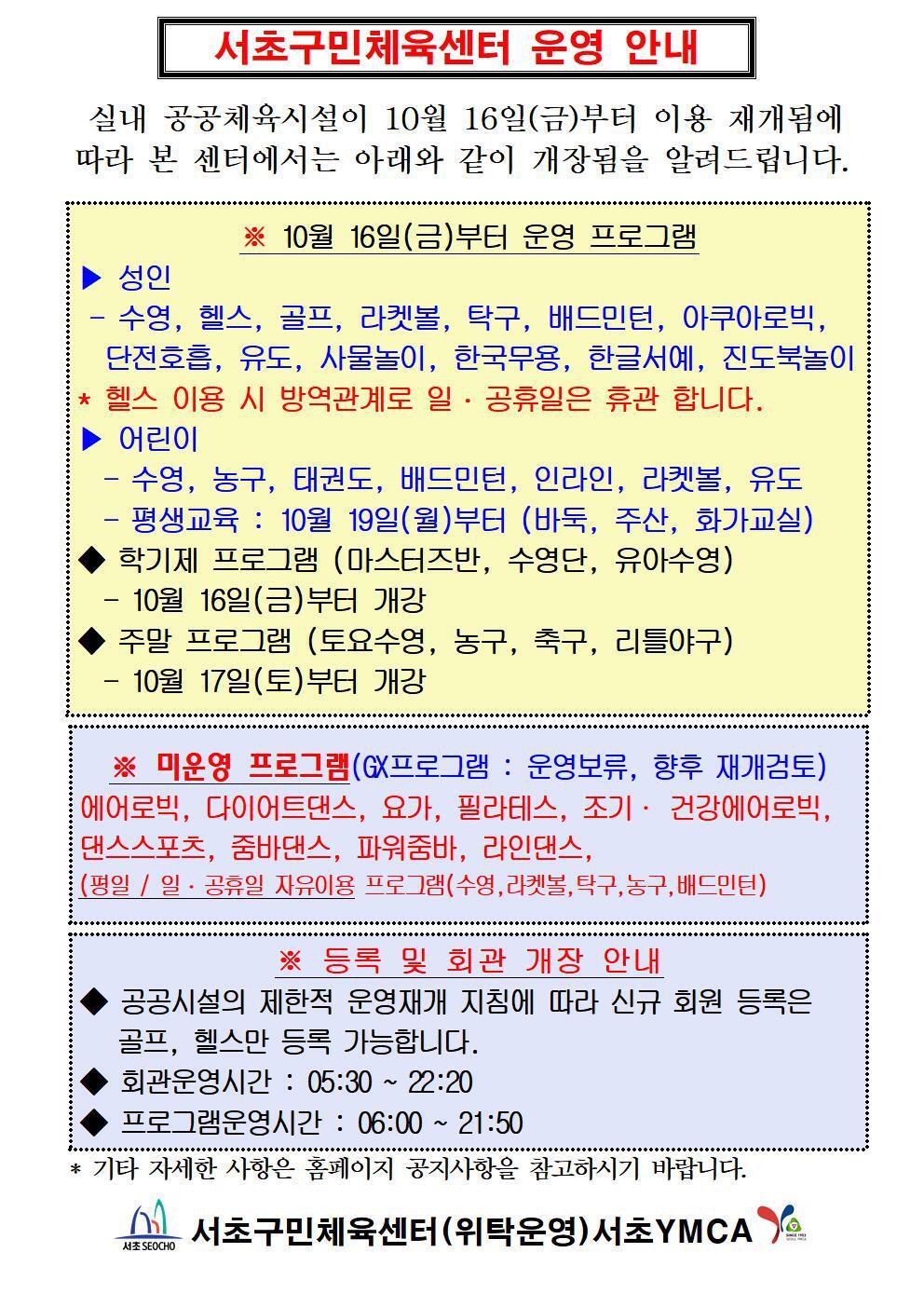 서초구민체육센터 10월 재개장 안내! 작성자 관리자 작성일 2020-10-15 08:45 조회 5104 좋아요 12 싫어요 19 인쇄 « 서초구민체육센터 8월 재개장 관련 시설이용 안내 2021년도 아기스포츠단 모집안내! » 목록보기 답글쓰기 Powered by KBoard