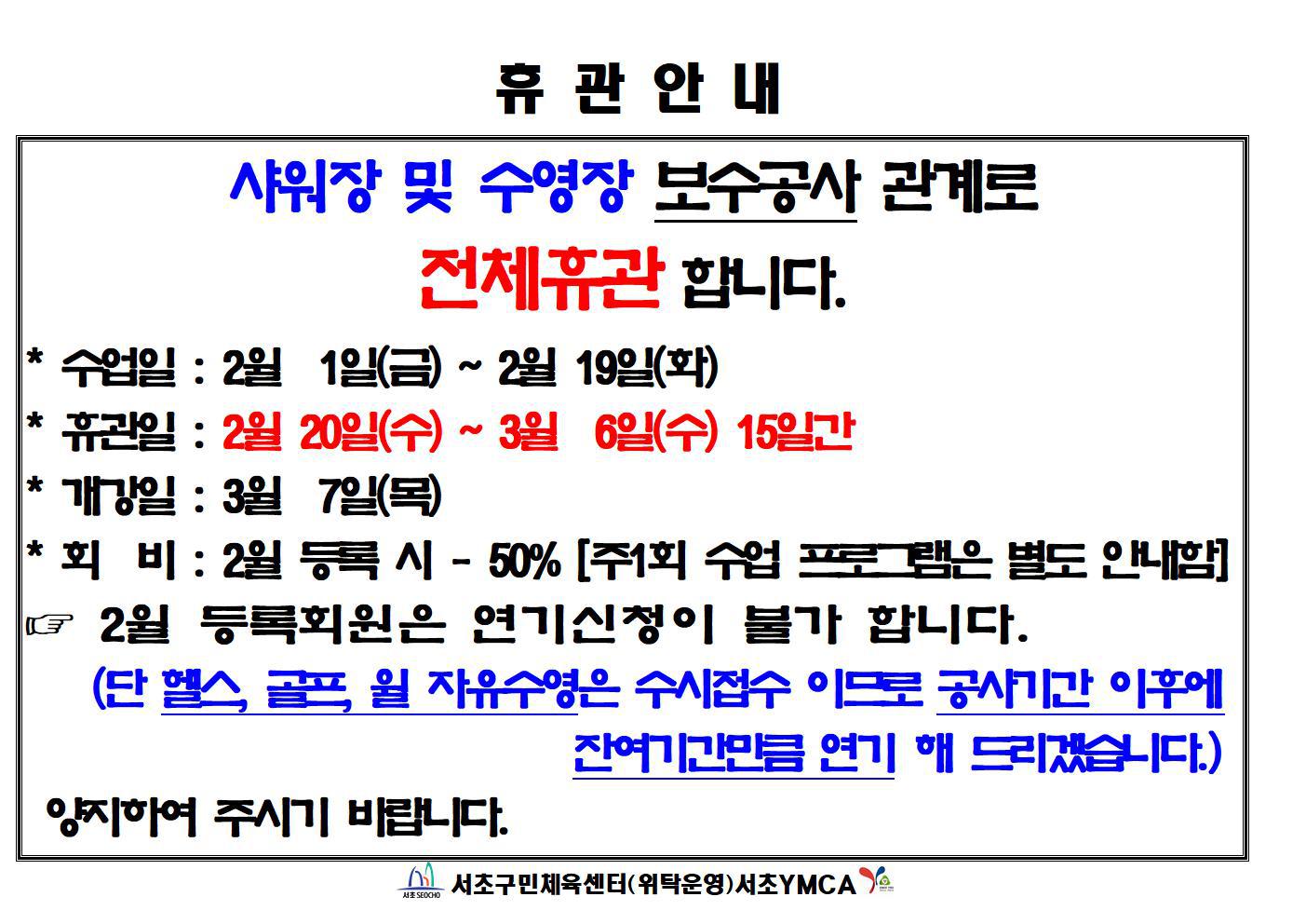 2019년 휴관안내 및 등록 안내! 작성자 관리자 작성일 2019-01-15 05:35 조회 3765 좋아요 4 싫어요 2 인쇄 « 2019년도 학기제 프로그램 안내 서초구민체육센터 할인적용 현황 » 목록보기 답글쓰기 Powered by KBoard