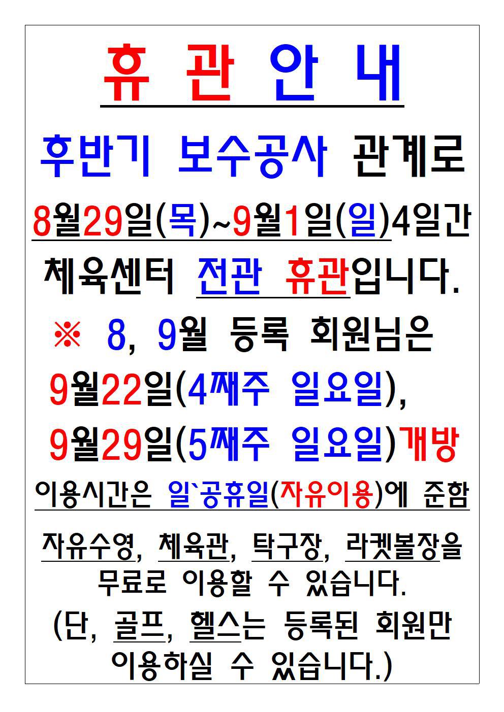 9월 하반기 공사 안내 및 자유이용 안내! 작성자 관리자 작성일 2019-08-20 04:43 조회 2966 좋아요 0 싫어요 5 인쇄 « 2019년도 2학기 연간프로그램 모집안내! 2019년 서리풀 축제 안내 » 목록보기 답글쓰기 Powered by KBoard