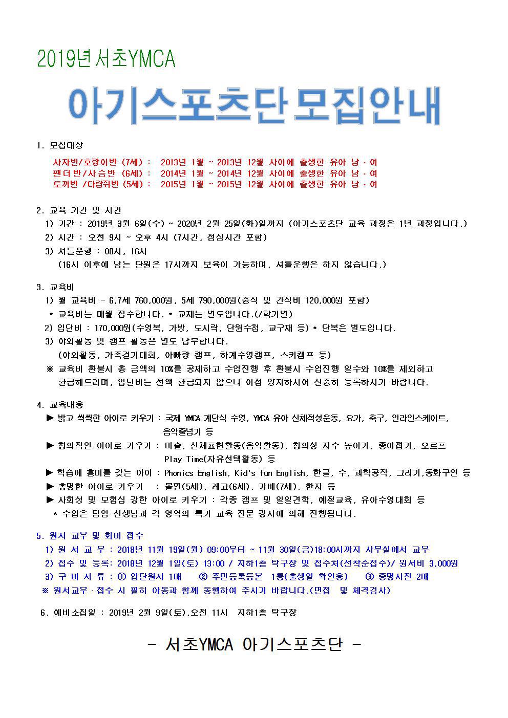 2019년도 아기스포츠단 모집안내! 작성자 관리자 작성일 2018-11-08 04:43 조회 2656 좋아요 3 싫어요 1 인쇄 « 주차장 요금 적용 (2018.9.1)부터입니다! 2019년도 겨울방학 프로그램 안내! » 목록보기 답글쓰기 Powered by KBoard