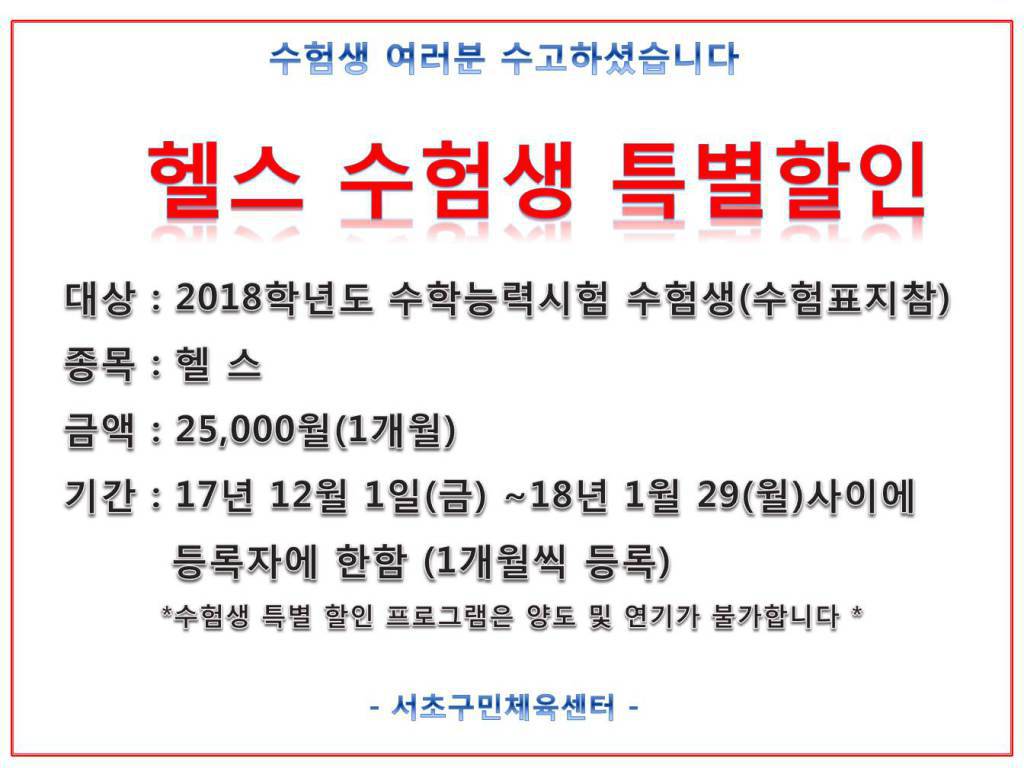 수험생 특별 할인 작성자 관리자 작성일 2018-01-02 02:15 조회 3663 좋아요 0 싫어요 0 인쇄 « 18년도 YMCA 스키학교 모집안내 2023 아기스포츠단 입단식 » 목록보기 답글쓰기 Powered by KBoard